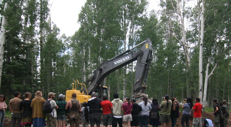 It is a bright July morning in Northern Arizona.  White clouds drift above the road.  It is monsoon season, but there is no hint of storm on its way.  I drive on a winding two lane that goes up to Snowbowl, a small ski resort on this desert mountain.  A mile or so of the road is reduced to one lane because the ski resort is dynamiting and gouging a trench in which they plan to lay pipes in which treated wastewater will be carried to make fake snow.  Thousands of Native Americans, their supporters and environmentalists have battled the Snowbowl’s plan for at least ten years — in the courts, on the streets, in the parking lot of the resort, in front of Flagstaff’s local newspaper office, on-line and, most recently, by locking themselves down to the equipment that is now lacerating the face of the mountain.  A week ago, a group of activists set up an encampment and invited others to join them.  They set up a central Cook Shack and information tent.  (During slavery in America, the Cook Shack was the place slaves would meet to plan their escapes to the North.  There, they were safe from the master and the master’s spies.)  And today we will gather in a circle and pray.