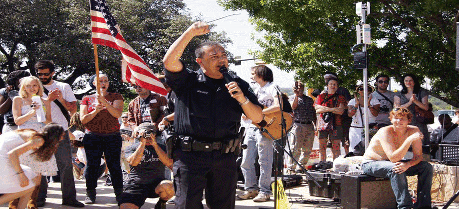 “I’m a police officer. I’m part of the 99 percent…. In the ’60s when people would protest, would gather in order to bring about change, right? Those protests were nonviolent, they were peaceful assemblies. They were broken up with dogs, hoses, sticks…. It looks like there was a square, and police shot tear gas. That could be the photograph or the video for our generation. That’s our Birmingham. So, twenty years from now this movement could be the turning point, the tipping point, right. It’s about time your generation stood up for something. It’s about time young people are in the streets…. Ya’ll don’t need to throw gas canisters into a group of people occupying an intersection.”
