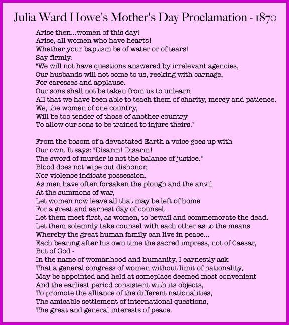 Howe saw the devastation and her politics clearly changed as a result. She  became a pacifist just a few years after supporting a war, a war she supported to promote justice for enslaved peoples. And while she may have admitted to friends in private correspondence the change, and to some degree her own responsibility as a writer of rousing words, not simply another mother, for its horrors, it is the Mother’s Day Proclamation that is her public writing, and in it, she shares nothing of that.